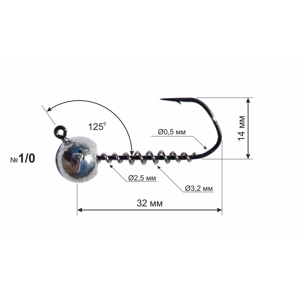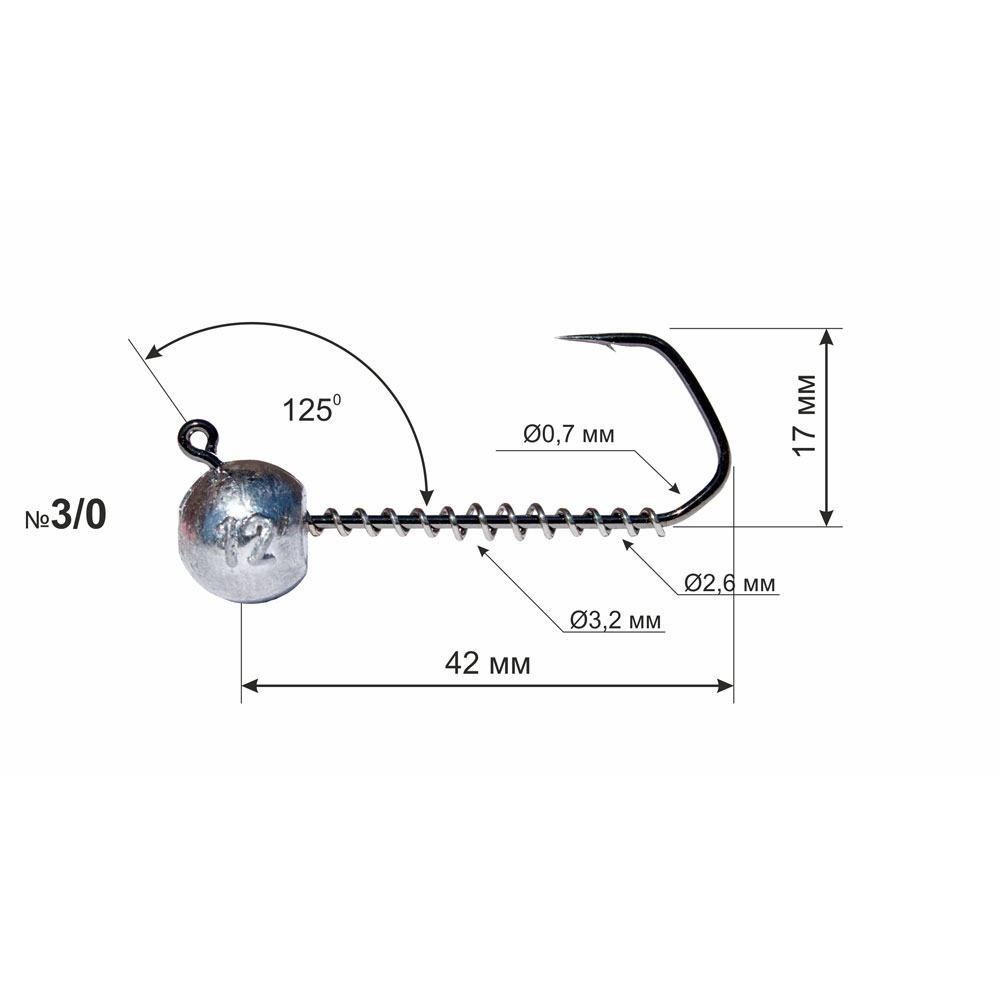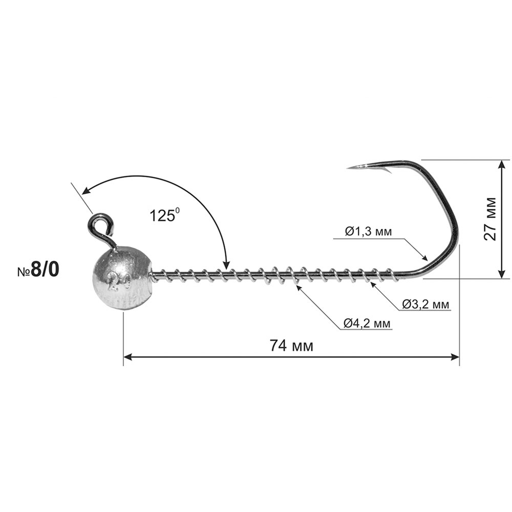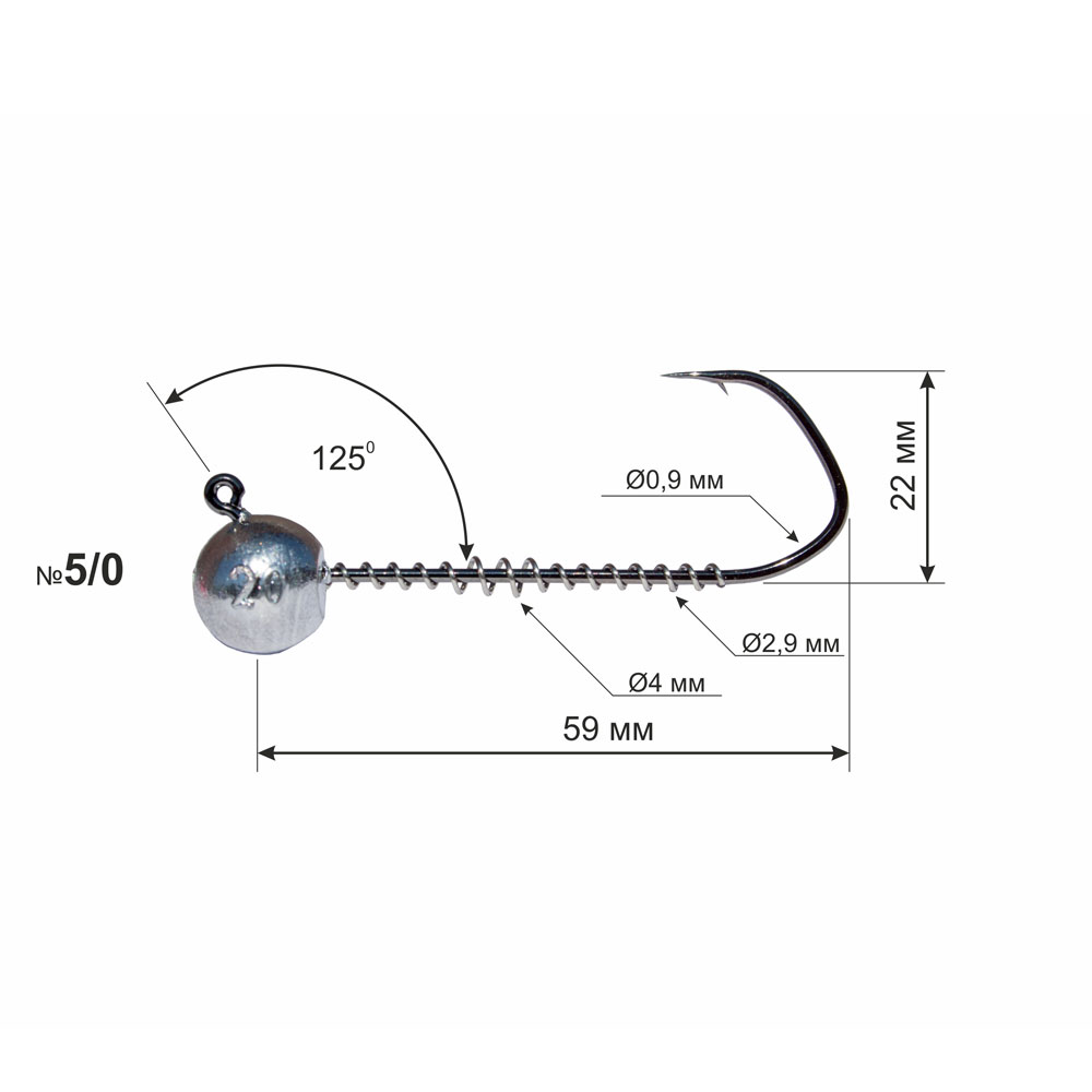 The hook is made of high carbon steel produced in Belgium (the steel used in the production of OWNER hooks). The main fixing element of the silicone bait is a coil spring. The uniqueness of the design lies in the dynamically changing diameter of the spring. The spherical sinker is made of quality C1 grade lead. The eye of the hook is bent at an angle of 1250, which gives a smoother and more natural wiring of the jig head when lifting from the bottom and lowering it back. Also, the 1250 angle allows you to hook and hold the fish more efficiently. The hook has a high quality black chrome coating, which allows the hook to be used when fishing in sea estuaries.