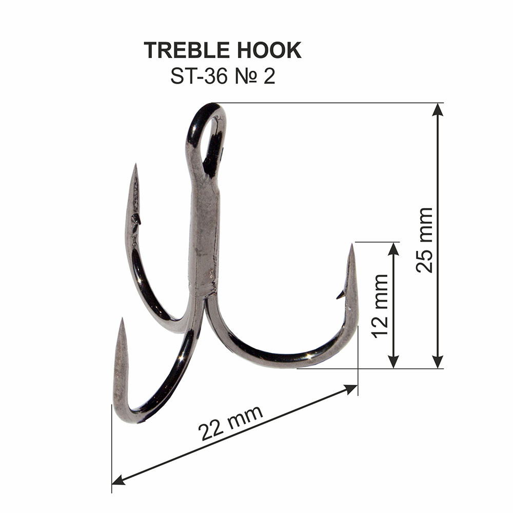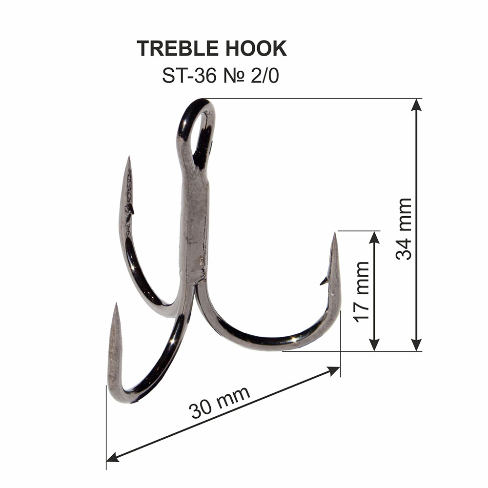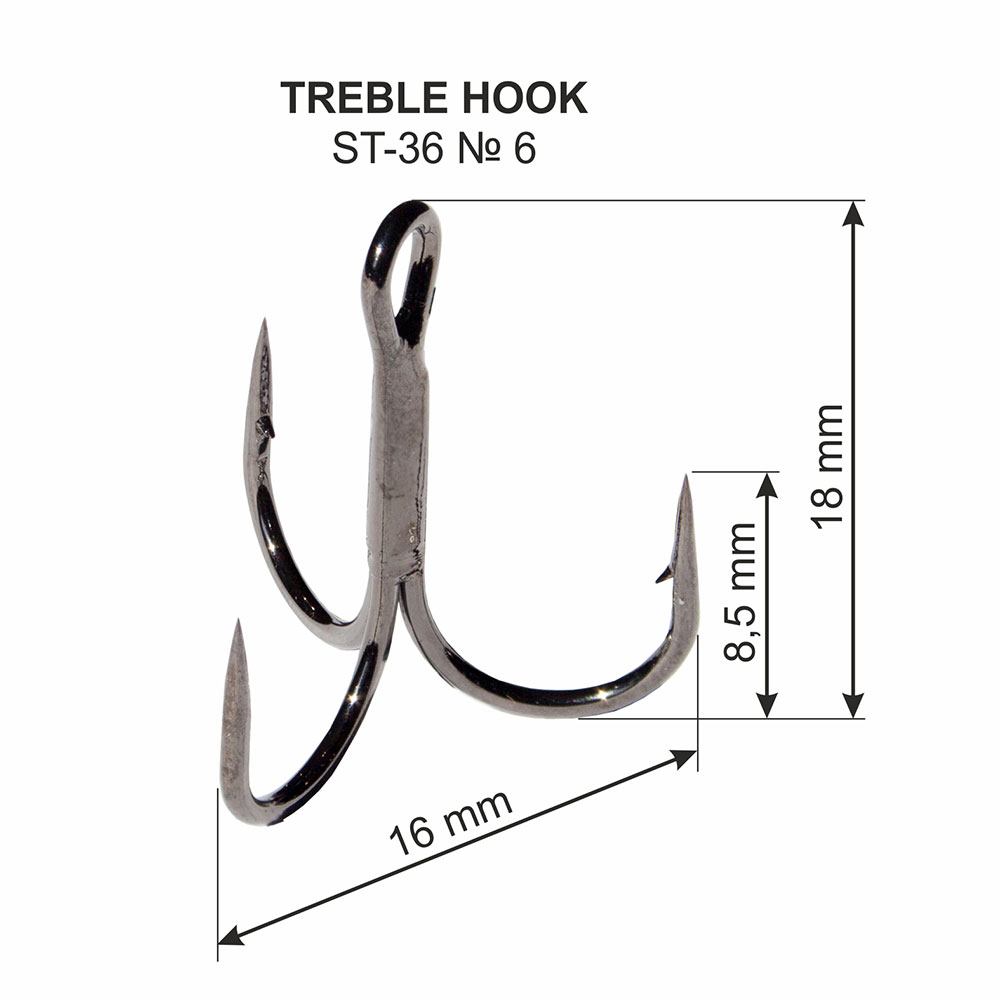 The ST-36 DS treble hook is made in Japan from high carbon steel. The quality indicators of the steel of the hook are completely balanced, it is both elastic and superbly rigid, which gives successful results when striking a predator. The tackle, which uses the classic tee, shows the highest result in fixing the fish on the hook. Ideally, this tee is combined with the weight of the corkscrew head with the equipped silicone. Tees are usually equipped with wobblers, spinners and silicone baits. This type of hook has a special anti-corrosion coating, black chrome, which allows you to maintain the quality of the hook for a long time even in salt water.