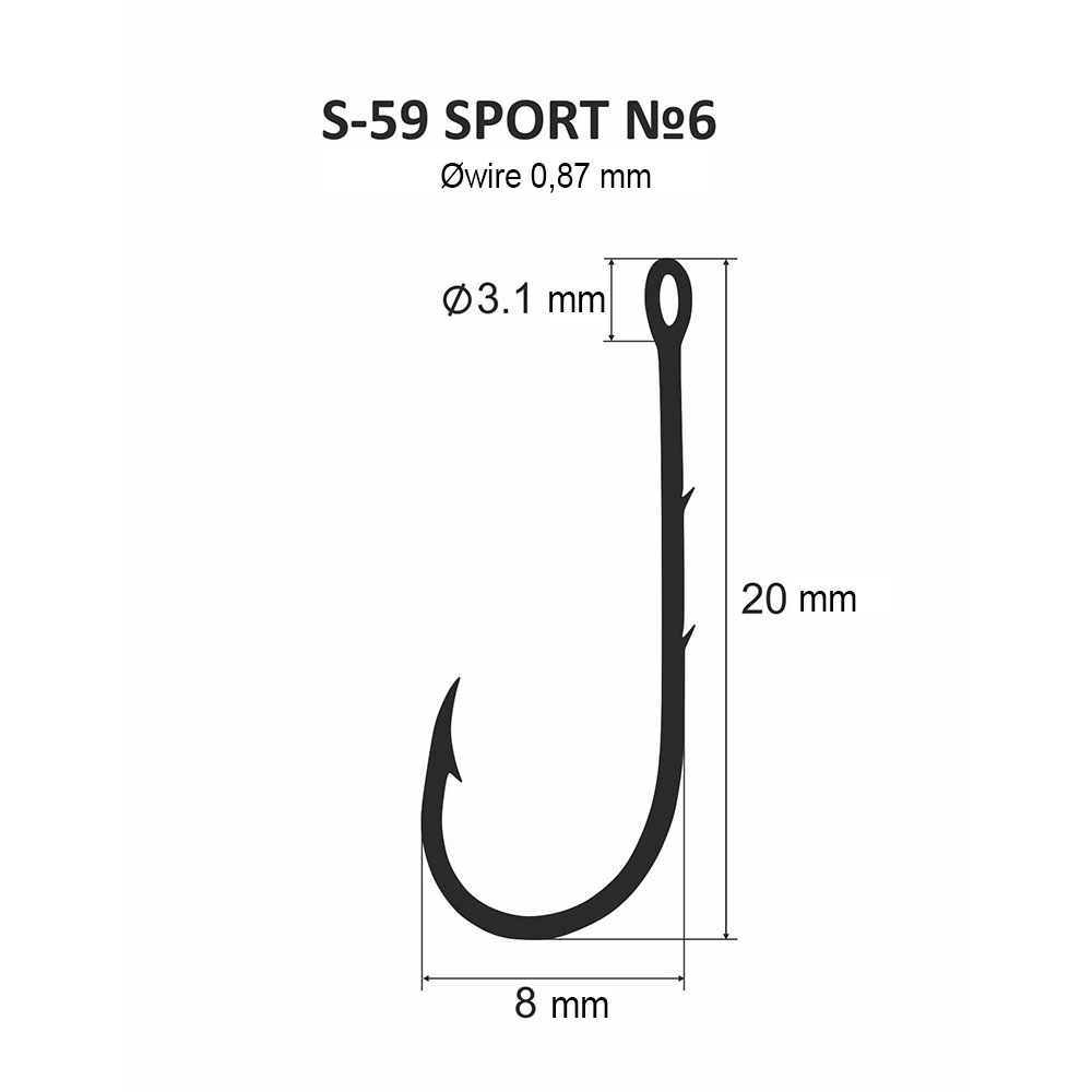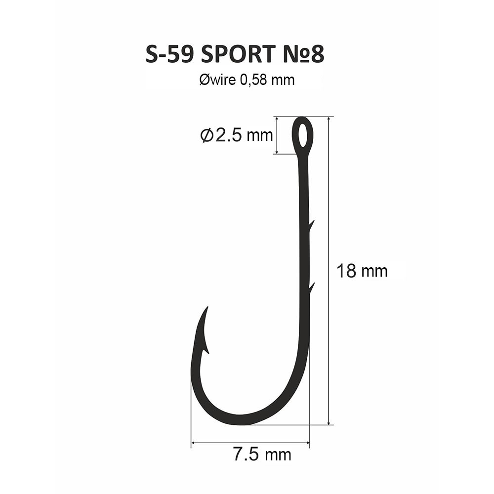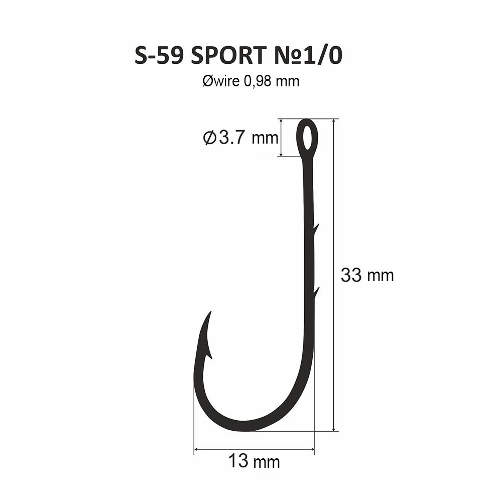 Спортивный рыболовный крючок DS (S-59 Sport hook) имеет чрезвычайно высокие прочностные характеристики. Изготовлен из особой высокоуглеродистой стали, произведенной в Корее, не уступающий аналогам от японских именитых производителей. Крючок имеет ряд своих особенностей. Жало у крючка крайне острое, так как имеет специальную заточку. Крючок S-59 SPORT идёт с увеличенным ушком, что делает его максимально подвижным в монтаже, и как результат, игра нанизанной приманки выглядит более естественно. Стоит также отметить цевьё с двумя зазубринами (бейтхолдер), позволяющими крепко удерживать силиконовую приманку не допуская соскальзывания и проворачивания. S-59 Sport от Днипро-Свинец высоконадёжен для спортивной ловли хищной рыбы и имеет специальное антикоррозийное покрытие, чёрный хром, позволяющее надолго сохранить его качество даже в солёной воде.